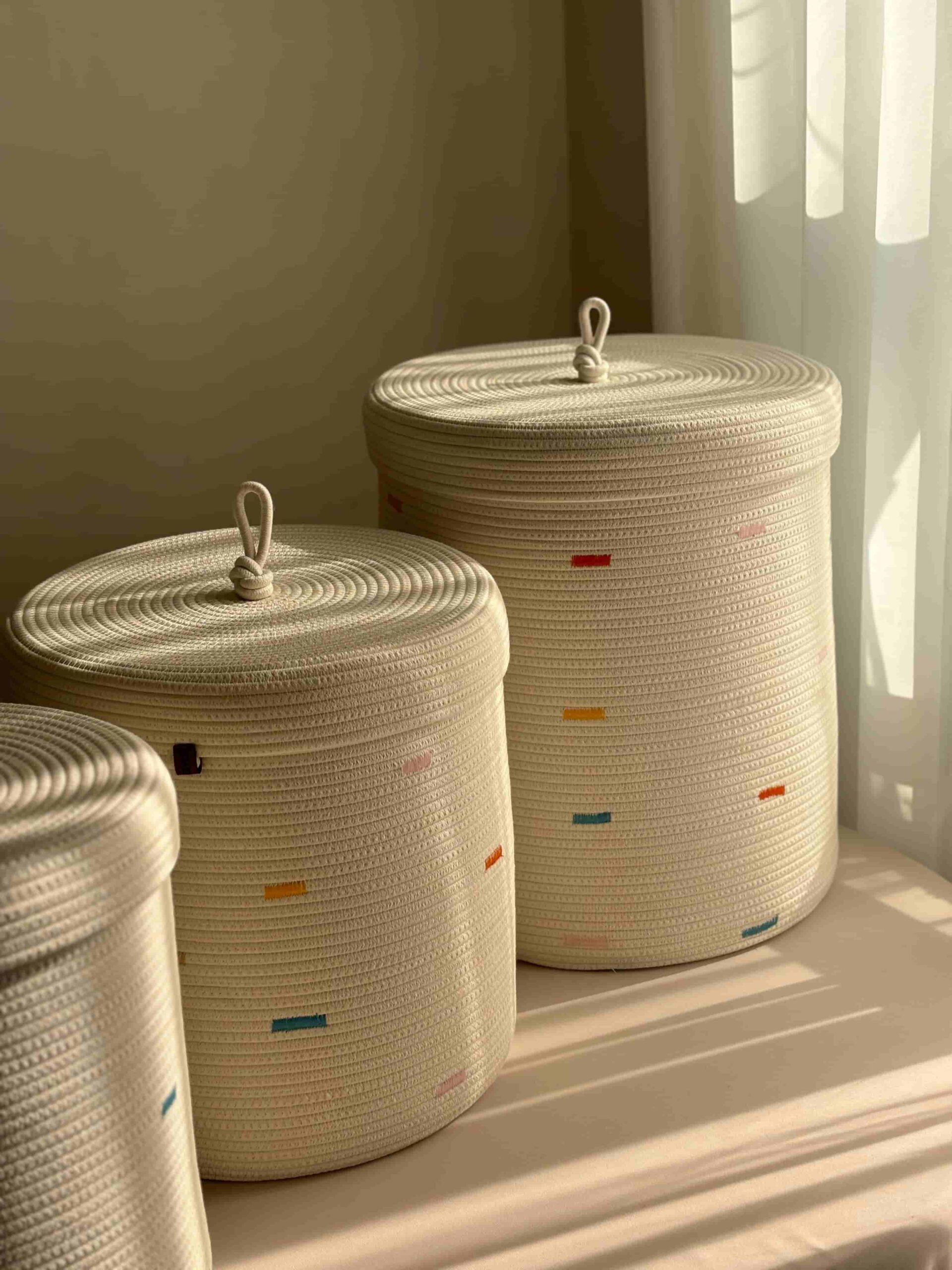 ست سبد کنفی کوک دوزی درب دار همراه کاور دستمال و نظم دهنده