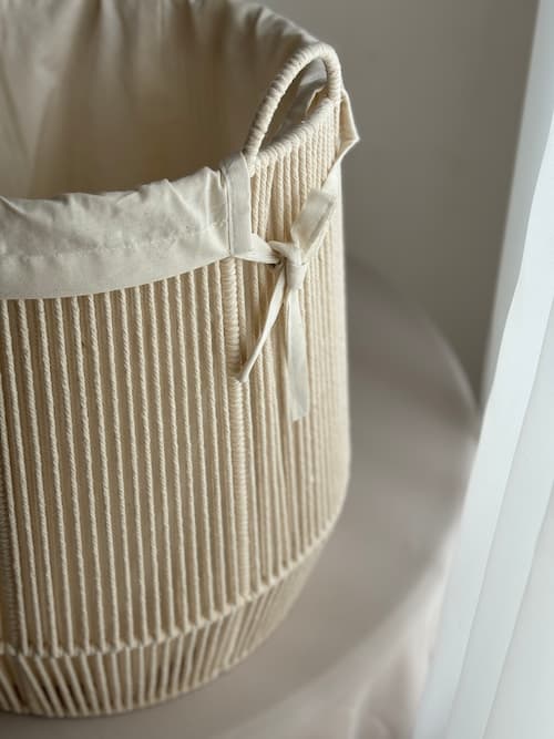 سبد خمره ای مکرومه رنگ شیری با طراحی خاص کاربردی موجود در مجموعه هنری زیگات میباشد که توسط هنرمندان مجموعه طراحی و تولید میشود.
